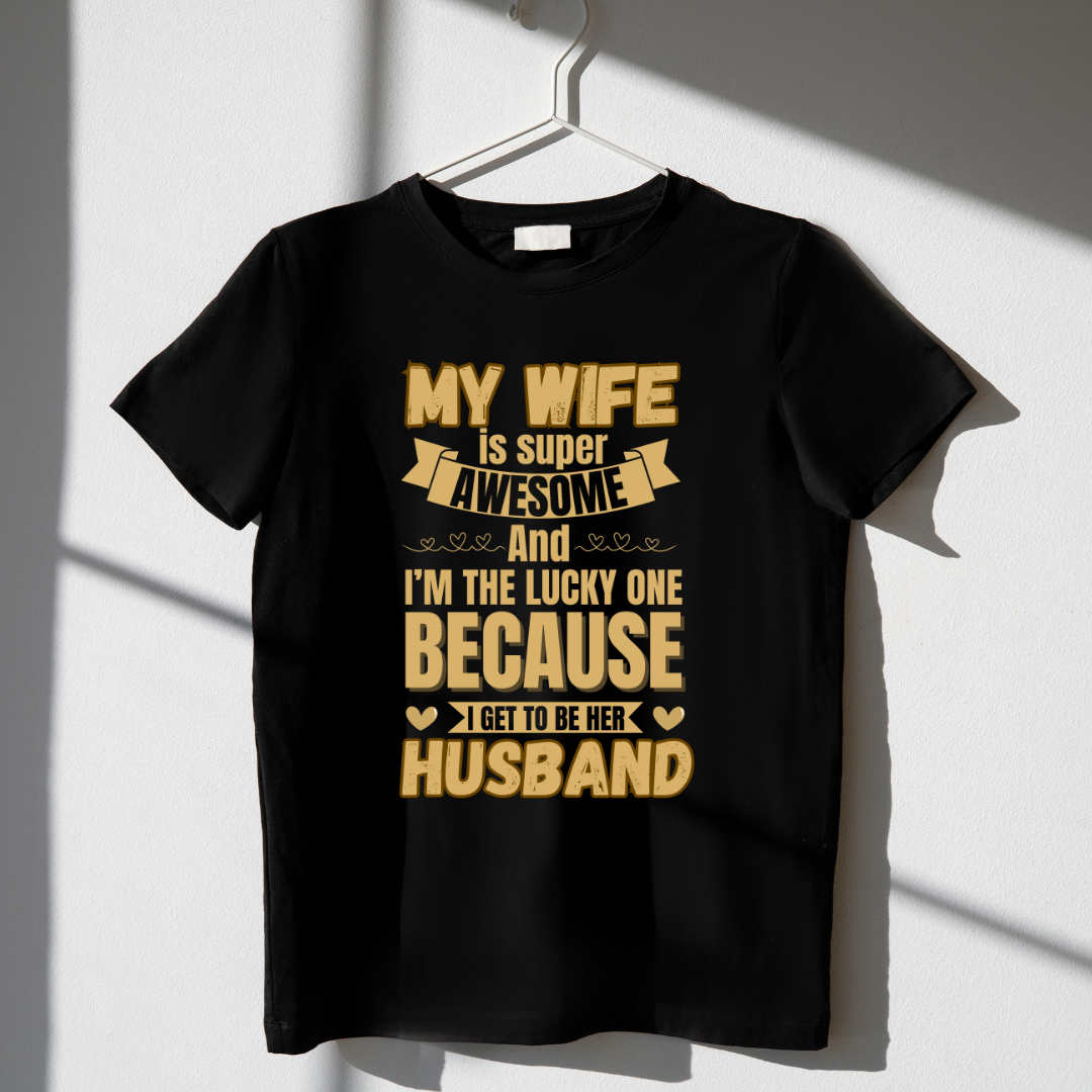 - Bold printed slogan: “My Wife is Super Awesome and I'm the Lucky one Because I Get to Be Her Husband”