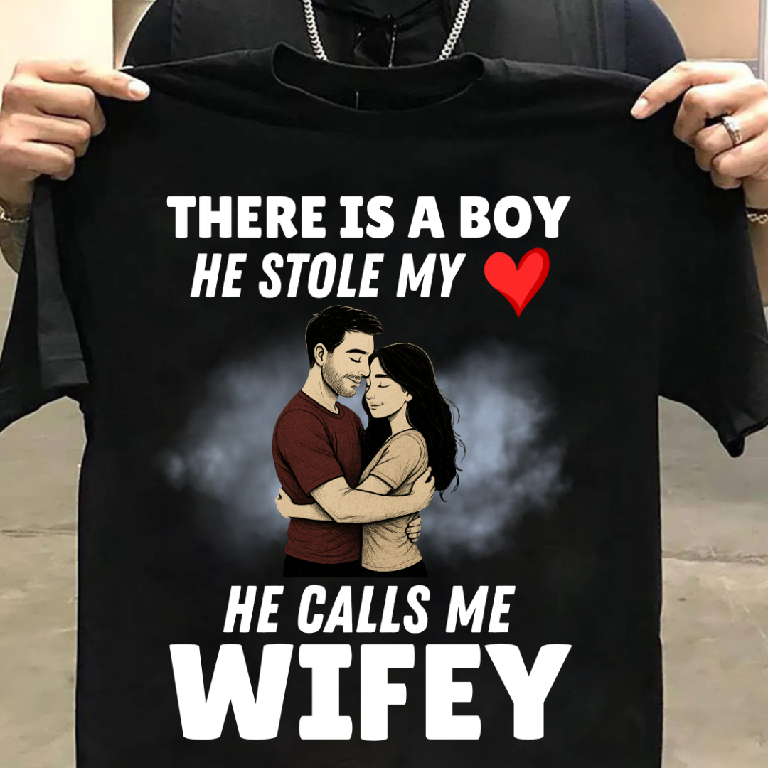 Show your love in style with this adorable “There is a boy, he stole my heart, he calls me wifey” shirt.